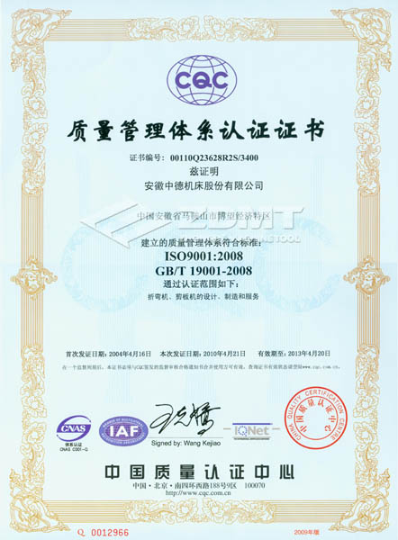 2010年4月,我公司順利通過了ISO 9001:2008版換證復(fù)審,獲得認證證書(證書編號:00110Q23628R2S/3400)。在此次復(fù)審過程中,中國質(zhì)量認證中心(CQC)對我公司的質(zhì)量體系運行情況進行了全方位嚴格審核,并對中德公司質(zhì)量管理工作給予了充分的肯定。